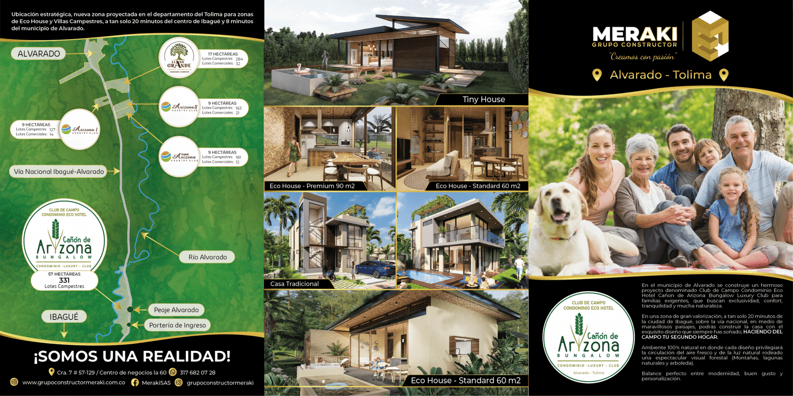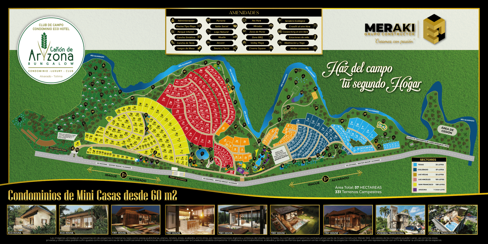 CAÑON DE ARIZONA BUNGALOW LUXURY CLUB se encuentra situado por uno de sus lados sobre la vía nacional Ibagué – Alvarado, con acceso exclusivo al costado izquierdo, justo antes del peaje de Alvarado, zona de alta valorización para su inversión y por el otro lado rodea en gran parte la ribera del río Alvarado siendo este una importante fuente hídrica adicional a los dos lagos naturales con los que cuenta el proyecto.